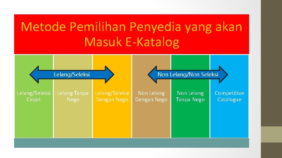 Langkah kelima Pemilihan penyedia dilakukan proses lelang atau bila tidak lelang dillakukan negosiasi harga Langkah keenam Setelah terpilih penyedia katalog nya maka dibuatkan kontrak payungnya Langkah. Pendaftaran penyedia di E-Katalog melalui negosiasi. PENGADAAN BARANGJASA PEMERINTAH MELALUI E-PURCHASING Fadli Arif Direktur Pengembangan Sistem Katalog Disampaikan pada Sosialisasi Unit Layanan Pengadaan BarangJasa Daerah ULPD Pemerintah Provinsi DKI Jakarta dan Penggunaan Sistem e-Katalog Jakarta 13 Maret 2014 2.